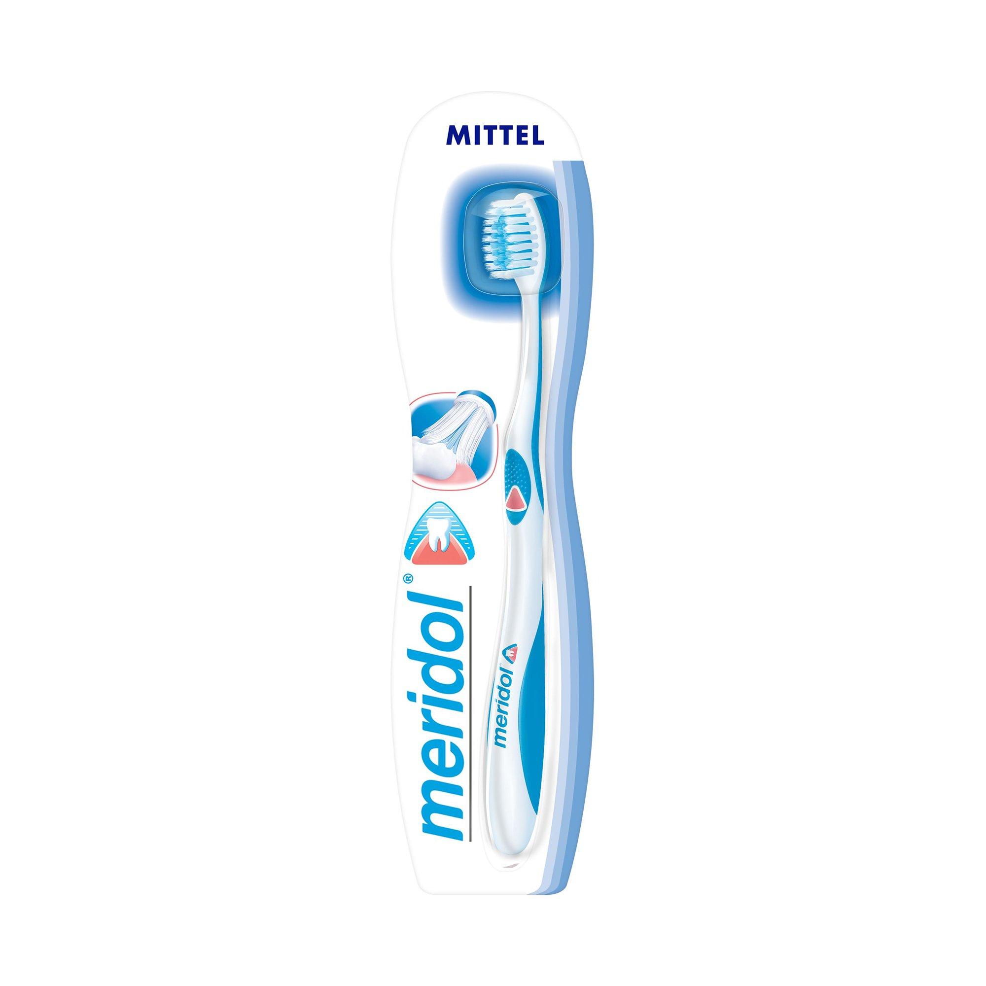 "Die meridol Zahnfleischschutz Mittel Zahnbürste verbindet eine gründliche Reinigungsleistung mit gleichzeitigem Zahnfleischschutz und dem Putzgefühl einer mittelharten Zahnbürste. Die Kombination aus einem mittelharten inneren Borstenfeld und weichen, etwas längeren Aussenborsten mit mikrofeinen Bürstenenden gibt Ihnen bei Ihrer täglichen Mundhygiene genau das Gefühl, das Sie sich wünschen. Der weich ummantelte Bürstenkopf Ihrer meridol Zahnbürste gleitet sanft durch den Mundraum, ohne Zähne, Zahnfleisch oder Zunge zu reizen. Speisereste und Plaque werden gründlich und effektiv entfernt – so haben Zahnfleischprobleme und Karies keine Chance. Dank des ergonomischen Griffs liegt die meridol Zahnfleischschutz Mittel Zahnbürste äusserst angenehm in der Hand, lässt sich gut in alle Bereiche des Mundraums führen und erreicht selbst schwer zugängliche Stellen.