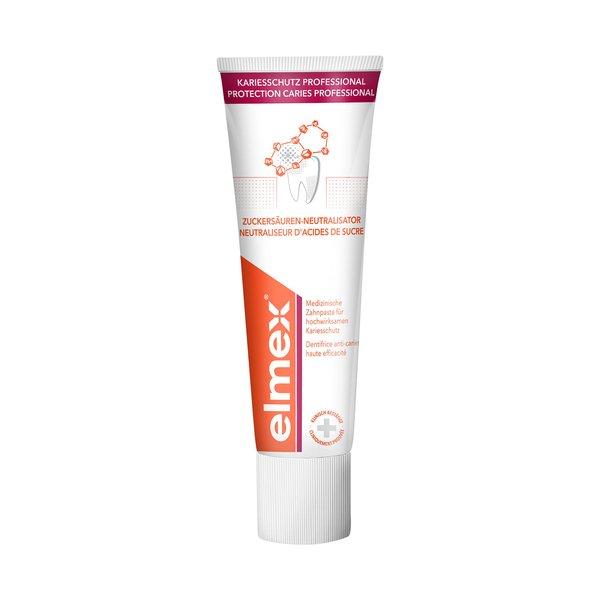 Die elmex Kariesschutz Professional Zahnpasta ist Ihr leistungsstarker Partner im Kampf gegen Karies. Die innovative Zahnpasta bekämpft mit ihrem patentierten Zuckersäure-Neutralisator Karies, bevor sie entstehen kann. Zuckersäuren sind in vielen Nahrungsmitteln und Getränken enthalten. Sie sind die hauptsächlichen Verursacher von Karies. Die elmex Kariesschutz Professional Zahnpasta neutralisiert diese Säuren direkt im Zahnbelag und arbeitet gegen ihre destruktive Wirkung an, bevor sie den Zahnschmelz angreifen können. Kalzium und Fluorid tragen dazu bei, bereits entstandene Demineralisierungen wieder rückgängig zu machen. Dadurch entsteht eine 4-mal bessere Remineralisierung als bei der Verwendung einer herkömmlichen Zahnpasta mit der gleichen Fluoridkonzentration. Die Wirksamkeit der elmex Kariesschutz Professional Zahnpasta wurde in wissenschaftlichen Tests bestätigt.Zucker steckt in viel mehr Lebensmitteln, als Sie denkenAnders, als viele Menschen meinen, stecken nicht nur Süssigkeiten, Snacks und Getränke voller Zucker. Auch in vielen anderen Nahrungsmitteln, darunter auch in Obst und Gemüse, versteckt sich das süsse Gold. So gelangt der Zucker den ganzen Tag über an unsere Zähne und bildet dort gefährliche Zuckersäuren, die den Zahn schwächen. Zuckersäuren sind die Hauptursache von Karies.Wie wirkt elmex Kariesschutz Professional Zahnpasta?elmex Kariesschutz Professional Zahnpasta geht über die konventionelle Kariesprävention durch Fluoride hinaus, indem sie den Hauptverursacher von Karies einfach neutralisiert. Doch wie funktioniert das genau? Zwischen dem Zähneputzen wächst und gedeiht der sogenannte Biofilm auf unseren Zähnen. Dieser Biofilm baut Zucker aus unserer Nahrung ab und bildet so Zuckersäuren, die unsere Zähne angreifen. Dadurch verändert sich der pH-Wert im Mundraum und der Zahnschmelz beginnt langsam, zu demineralisieren. Wenn dieser Prozess anhält, entstehen irreversible Beschädigungen am Zahn. Herkömmliche Zahnpasten greifen mit Fluorid in diesen Prozess ein. Denn Fluorid kann die Demineralisierung verringern und die Remineralisierung verstärken. Allerdings: Fluorid neutralisiert keine Zuckersäuren.Der innovative Zuckersäuren-Neutralisator mit Fluorid von elmex Kariesschutz Professional begegnet dem schädlichen Einfluss von Zuckersäure, bevor der Zahn in Mitleidenschaft gezogen wird. Ein echter Durchbruch in der Karies-Prävention! Die Zahnpasta enthält Arginine, das auch natürlich im Speichel enthalten ist. Diese Aminosäure sorgt nach dem Konsum zuckerhaltiger Lebensmittel dafür, dass der pH-Wert im Mundraum wieder ein gesundes Niveau erreicht und ein basisches Milieu entsteht. In dem sich die Zuckersäure nicht wohlfühlt. Sie wird neutralisiert. Im Anschluss tragen Kalzium und Fluorid dazu bei, entstandene Demineralisierungen wieder rückgängig zu machen und Zähnen und Zahnschmelz Mineralien zuzuführen.