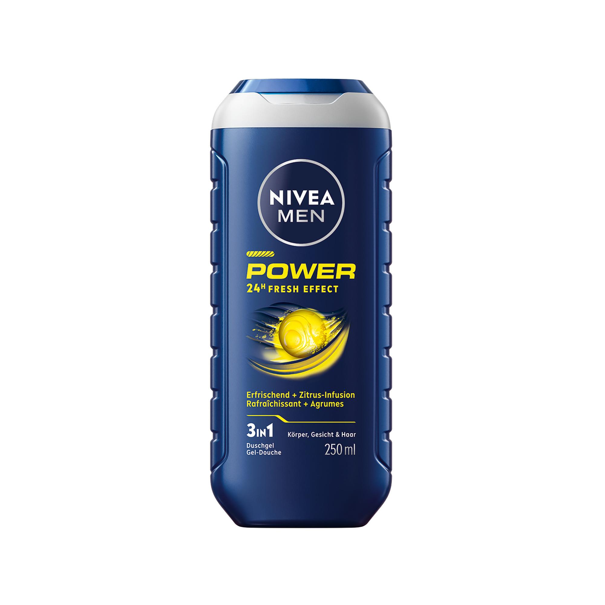 Kühlt, reinigt und erfrischt – das belebende NIVEA MEN Power Fresh Duschgel. Dank der erfrischenden Formel mit Menthol und dem belebenden Duft des Zitrus-Komplexes verleiht das Duschgel der Männerhaut ein revitalisiertes Gefühl. Haut und Haare werden gründlich gereinigt und erfrischt. Das Duschgel für Männer, die einen kraftvollen Start in den Tag mit einem 24h Frischegefühl wollen: NIVEA MEN Power Fresh Pflegedusche gemäss OECD oder äquivalenten Methoden *ohne Verschlusskappe und Label
