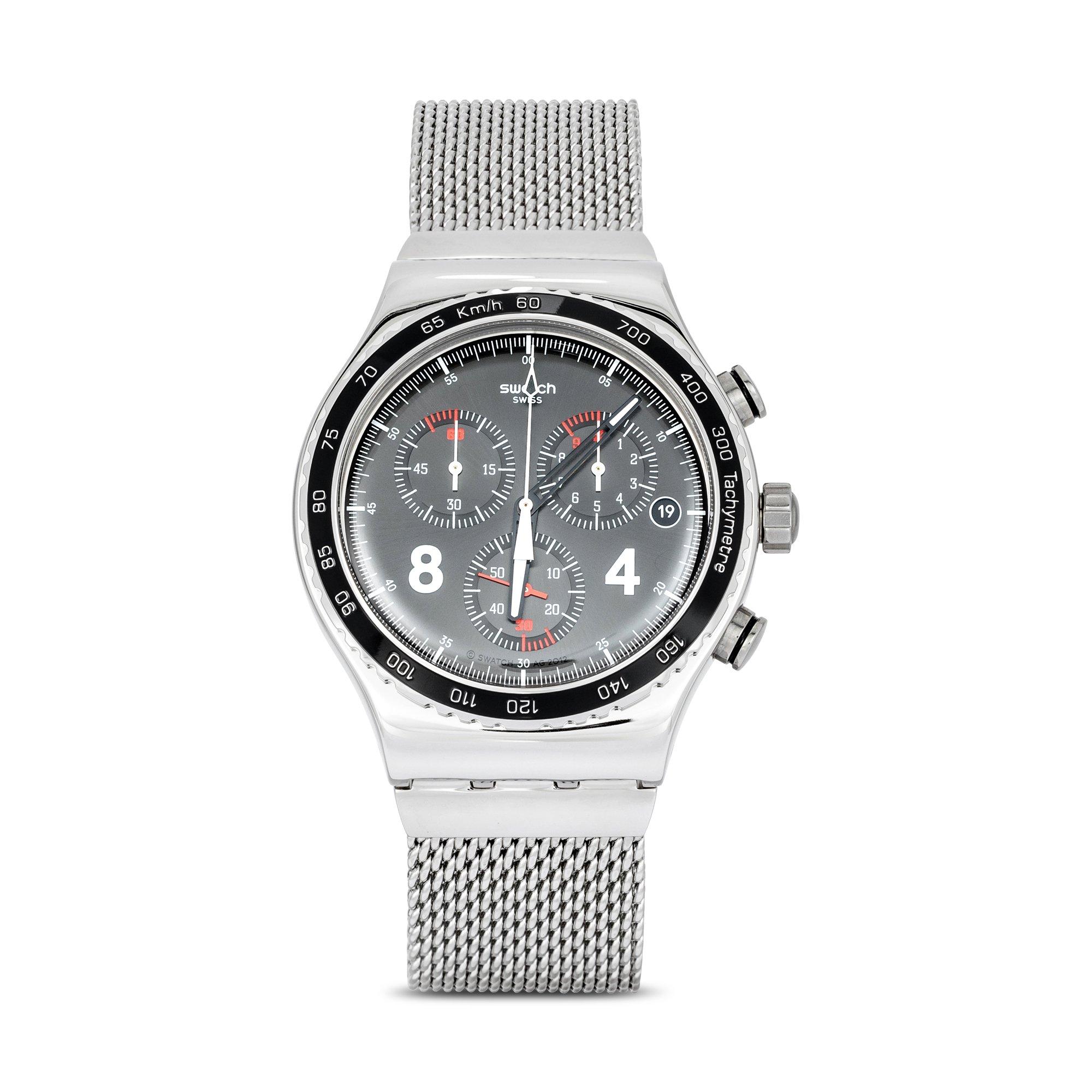 Diese Uhr von Swatch zeichnet sich durch das silberne Design mit dem Milanese-Armband aus. Das Zifferblatt ist in Schwarz gehalten mit weissen und roten Akzenten. Die Uhr ist wasserdicht und mit einem Quarzuhrwerk ausgestattet, welches eine Datums- und Chronographenfunktion hat.