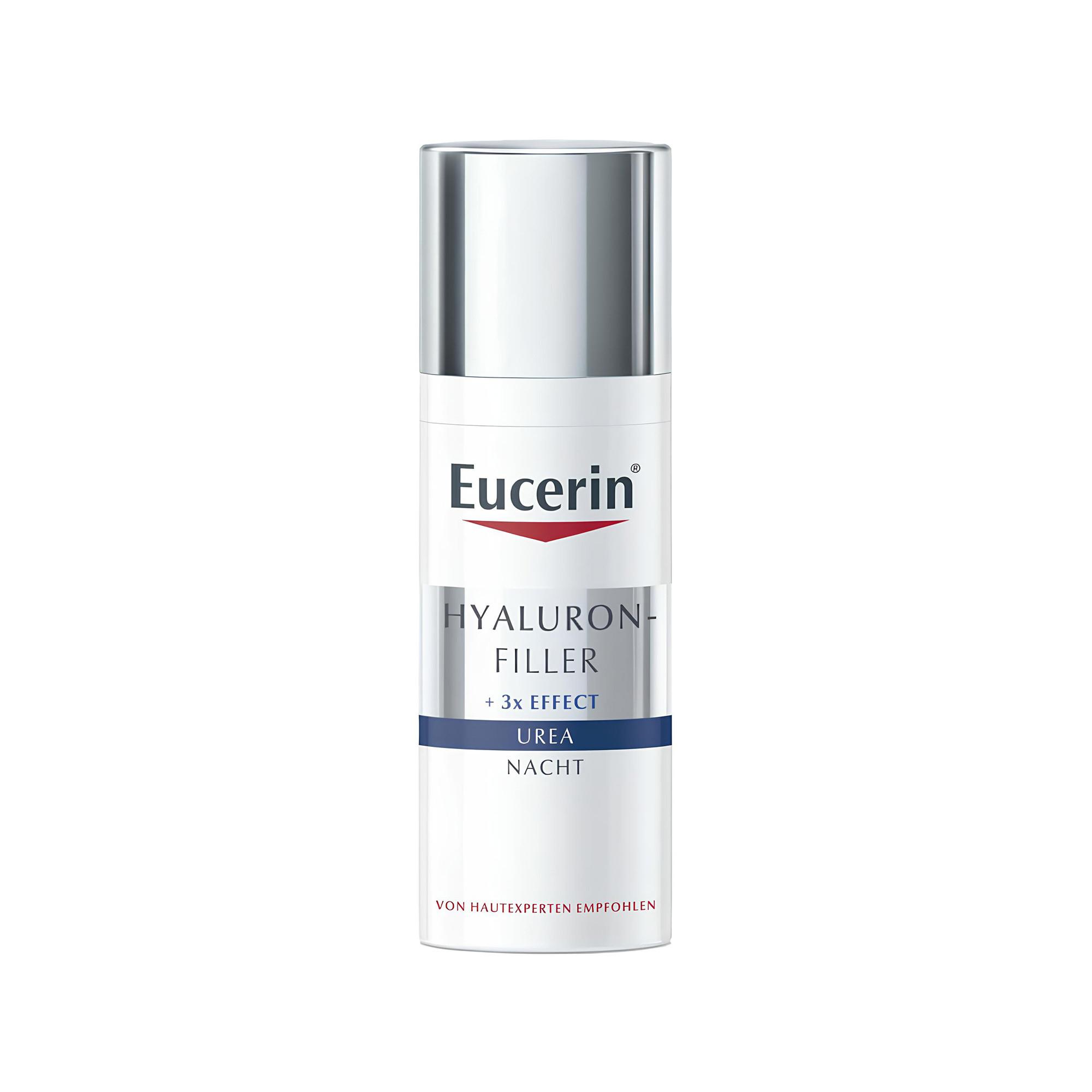 Eucerin HYALURON-FILLER + 3x EFFECT + Urea Nachtpflege spendet intensive Feuchtigkeit, mildert das Erscheinungsbild von Trockenheitslinien und Falten mit 5% Urea und Hyaluronsäure.