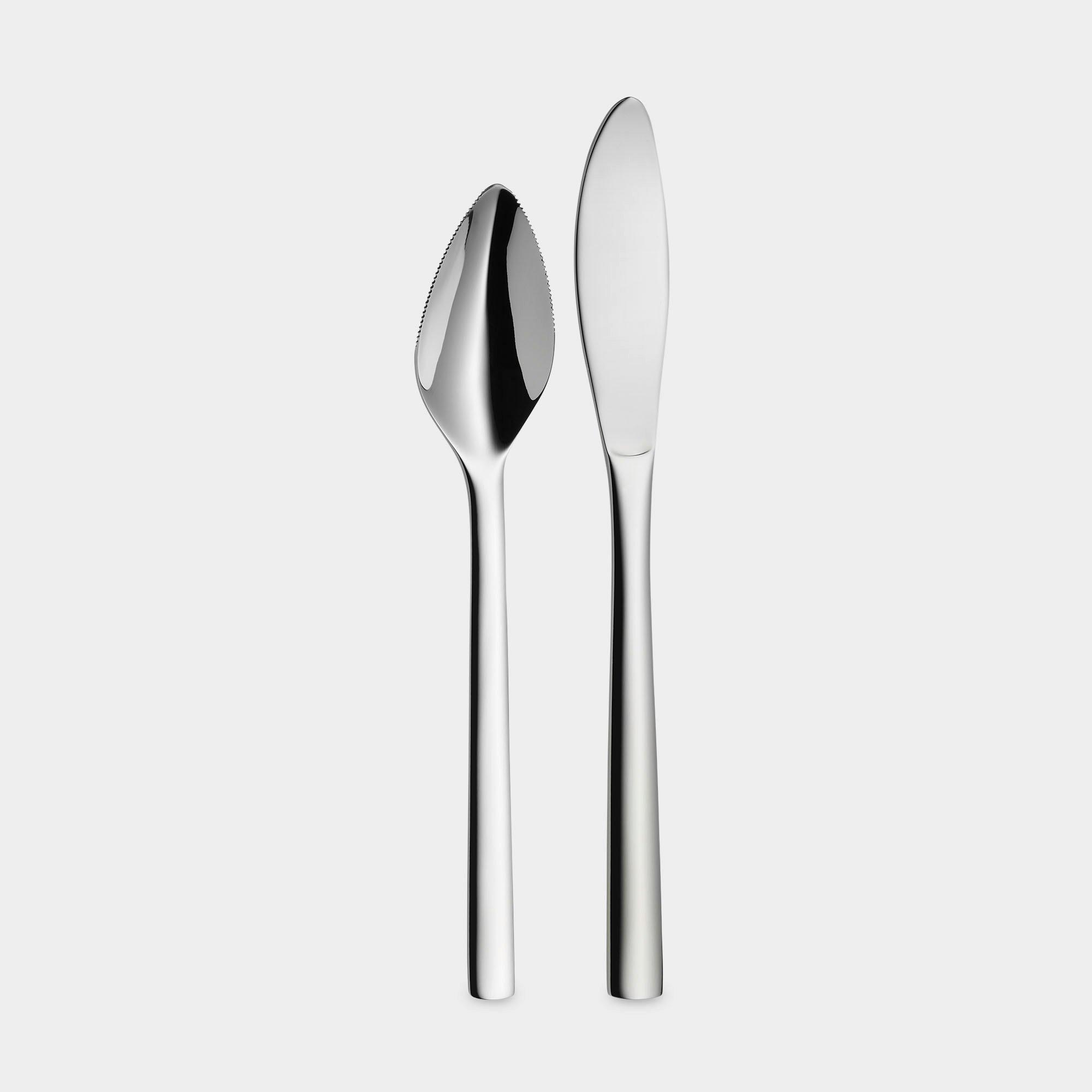Das zweiteilige Grapefruitbesteck aus der Serie Nuova von WMF passt durch sein zeitloses Design zu vielen Besteck-Serien.