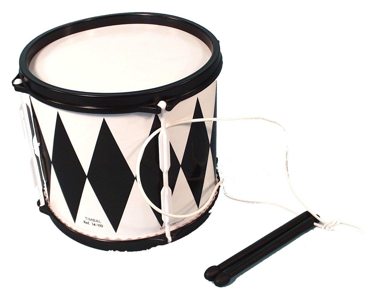Trommel Basel, weiss mit schwarzen Rhomboiden, 2 Schläger, in Polybeutel 18 cm Durchmesser.