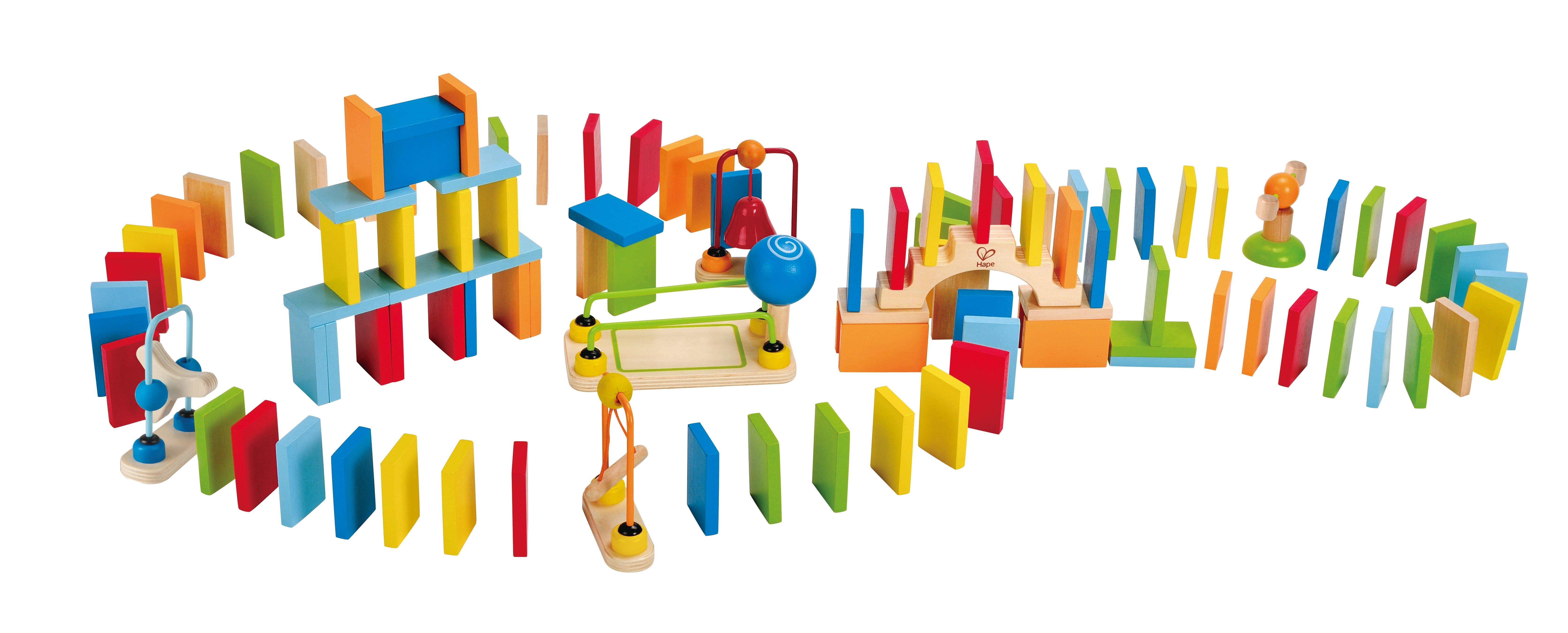 Hier sind deiner Fantasie keine Grenzen gesetzt. Bau deinen persönlichen Domino-Parcours mit 100 tollen Holzteilen. Integriere unter anderem eine Brücke und eine Glocke. Und am Ende? Reicht ein kleiner Anschubser und alle Steine fallen mit großem Tamtam nach und nach um.