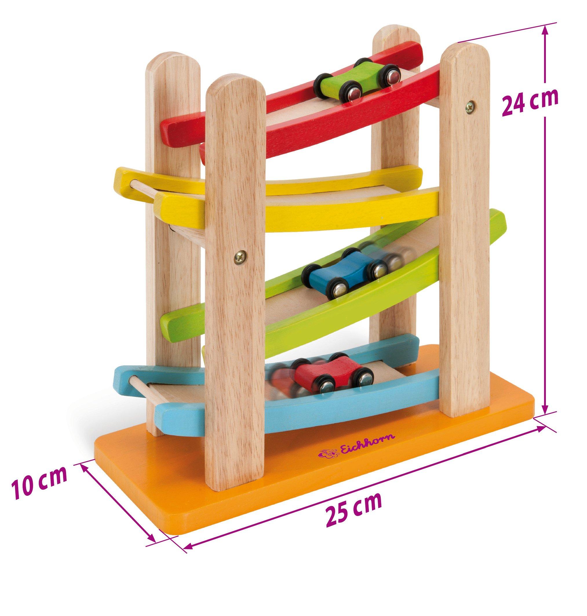 Die Eichhorn Color Autorennbahn mit den vier Etagen sieht klasse aus und ist für Kinder eine wunderbare Beschäftigungsmöglichkeit. Die Autos können von der oberen Etage bis zur letzten nach unten fahren, denn die einzelnen Ebenen sind an den Enden so konstruiert, dass die Autos im Zick-Zack-System nach unten rollen. Für Kinder ab einem Jahr geeignet.