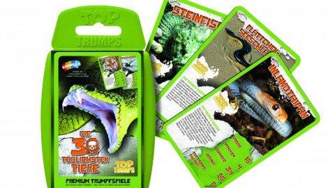 Achtung, jetzt wird es giftig! Das TOP TRUMPS Die 30 tödlichsten Tiere sorgt für informativen und spannenden Trumpfspaß mit den 30 gefährlichsten und giftigsten Tieren der Welt. Vor wem sollte man sich in Acht nehmen? Seewespe, Feuerfisch, Tigerhai, Rotrückenspinne sowie 26 weitere hochgefährliche Tiere treten der in den Kategorien „Größe, Giftigkeit, Schmerz, Gefahr und TOP TRUMPS-Faktor “ gegeneinander an. Verursacht die östliche Braunschlange größere Schmerzen als der Riesentausendfüßler? Ist das Salzwasserkrokodil gefährlicher als der Stachelrochen? Welches Tier hat das stärkste Gift? Finde es heraus mit dem TOP TRUMPS Die 30 tödlichsten Tiere!