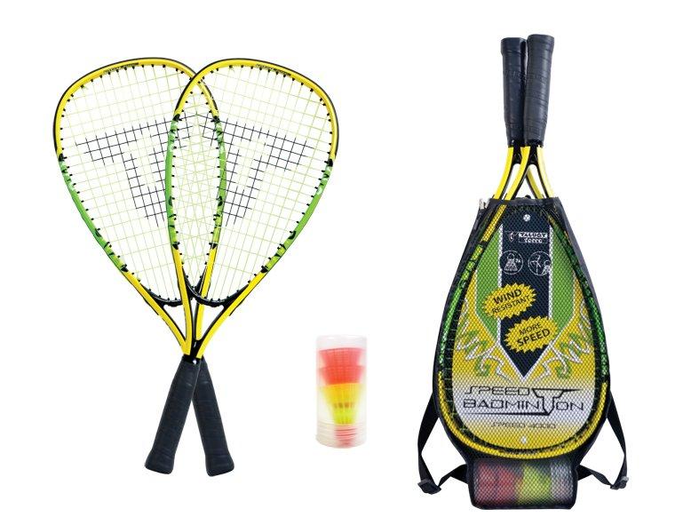 - Zwei handliche Schläger Speed 4000 aus gehärtetem Leicht-Aluminium für das Speed Badminton Freizeitspiel