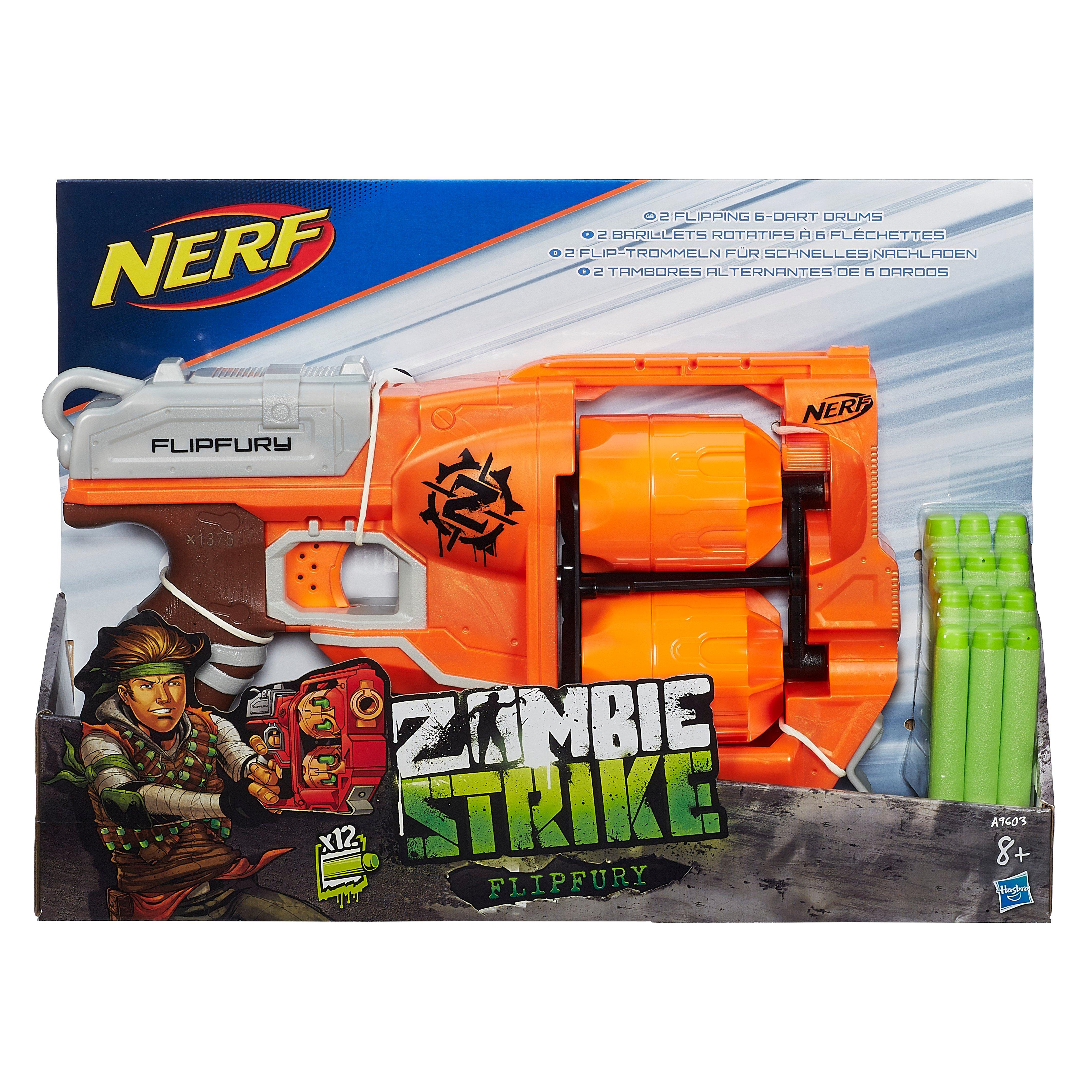Doppelte Blasteraction mit 2 Trommelmagazinen: Der NERF ZombieStrike FlipFury überrascht mit 2 Flip-Trommelmagazinen, die um 180 Grad gedreht werden können und je 6 Darts fassen. Ist ein Magazin leer, wird das zweite vor den Lauf gedreht und schickt weitere 6 Darts ins Ziel. 12 Elite Zombie Darts mit Reichweiten von 20 Metern sind enthalten.