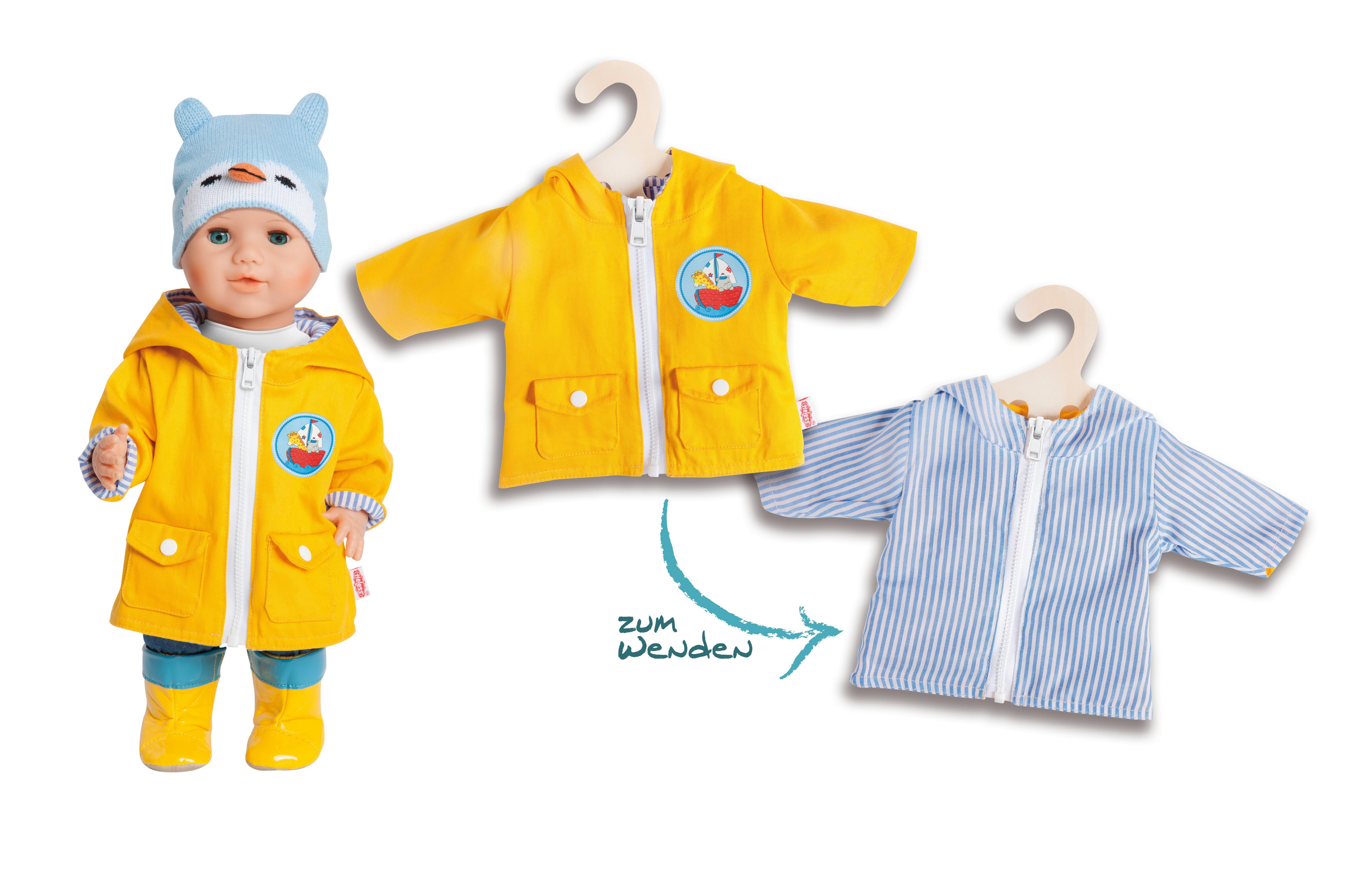 Der raffinierte Wendeanorak "Maritim" ist sowohl für Puppenmädchen als auch für Puppenjungen der perfekte Begleiter bei Wind und Wetter. Die gelbe Jacke im trendigen Segeljackenoutfit ist mit einem witzigen Segel Motivaufdruck versehen, die gewendete Seite verzückt mit seinem feschen Streifen-Look. Die Kapuze und die hochgeschlossene Kragenpartie schützen die Puppe vor Wind und Regen. Zwei Eingriffstaschen mit Druckknöpfen sorgen für warme Hände. Dank des durchgehenden Reißverschlusses lässt sich der Anorak leicht schließen. Dieses Puppen-Outfit wird auf einem Holzkleiderbügel geliefert und ist in den Größen 28-35 cm (Nr.1525) sowie 35-45 cm (Nr. 2525) verfügbar.
