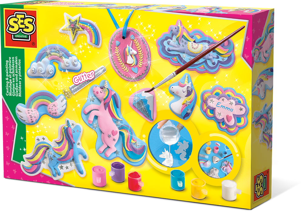 Du magst Einhörner auch so gern? Mit diesem Set von SES Creative machst du ganz einfach verschiedene, hübsche Einhornfiguren aus Gips. Gieße den Gips in die Form und lasse ihn aushärten. Hol dir die mitgelieferte Farbe und male die Einhörner in deinen Lieblingsfarben an. Das macht Spaß und das Ergebnis ist toll!