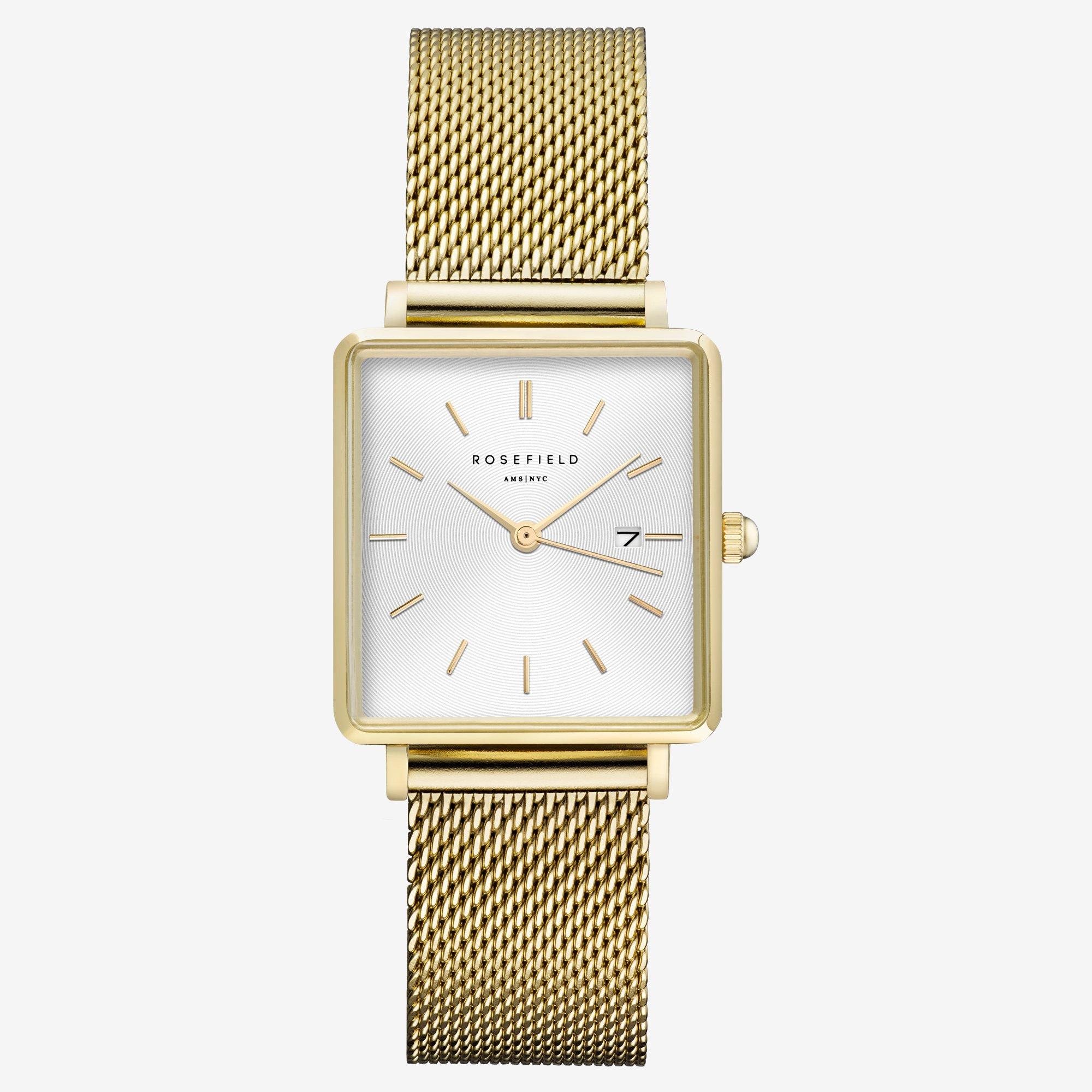 Diese durch und durch elegante Analoguhr von Rosefield überzeugt mit einem Milanaise-Armband, das sich perfekt um das Handgelenk schmiegt. Das Gehäuse hat eine eckige Form und ist extra flach gehalten. Das weisse Zifferblatt mit Strahlemuster bildet einen unaufdringlichen Rahmen für die goldenen Zeiger, Indizes und Datumsanzeige.