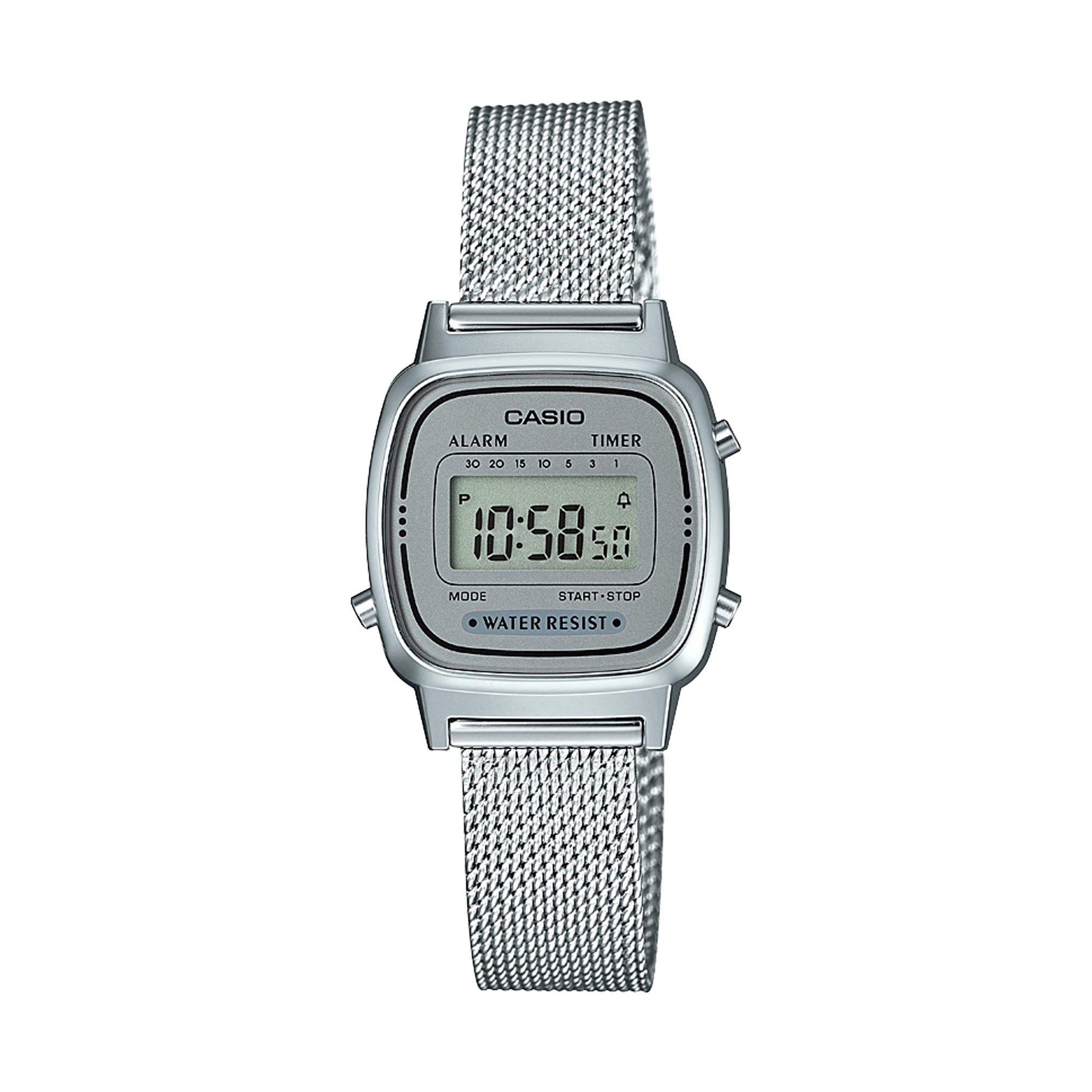 Die sportlich-elegante und quadratische Digitaluhr von Casio ist ausgestattet mit einem zarten silbernen Armband und bietet folgende Funktionen: Stoppfunktion, 7 Preset Timer (bis 30 Min.), Tagesalarm - an täglich wiederkehrende Ereignisse erinnert der Tagesalarm, Automatischer Kalender mit Datum, Monat und Wochentag.