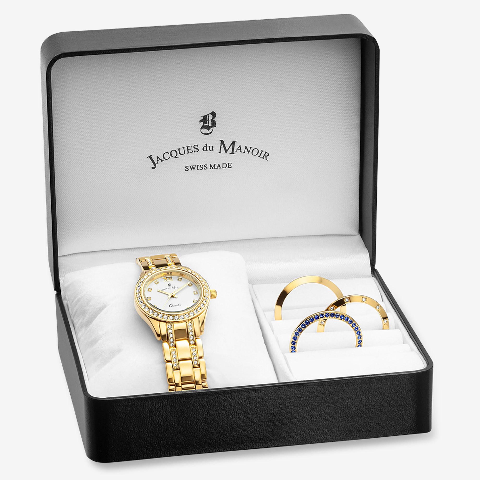 Dieses schöne Set von Jacques du Manoir beinhaltet die Analoguhr aus der Kollektion "Royal" sowie drei Lünetten zum Wechseln. Die Uhr besteht aus einem Edelstahlarmband und Edelstahlgehäuse und erstrahlt in schönem Goldton. Für zusätzliche Strahlkraft sorgen die funkelnden Steinchen auf dem Armband, auf der Lünette sowie auf den Stundenpositionen. Geschützt wird die Uhr von einem widerstandsfähigen Mineralglas, das für eine Wasserdichtigkeit bis 3 Bar sorgt.