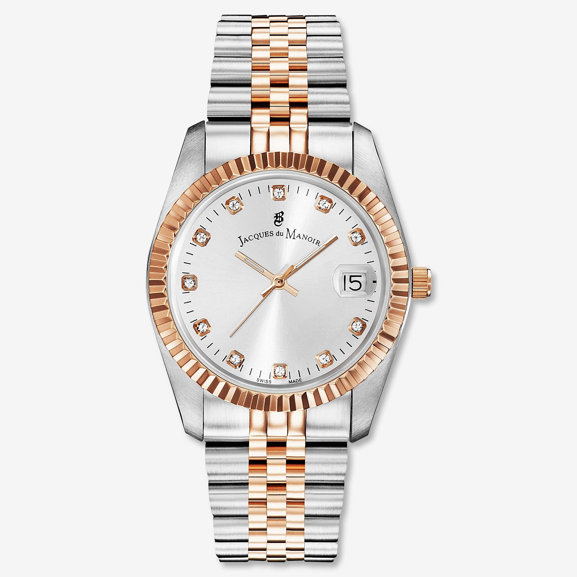 Diese Analoguhr von Jacques du Manoir aus der Kollektion "Inspiration" ist aufgrund der edlen Bicolor-Optik in Silber und Roségold ein wahrer Eyecatcher. Sie bietet eine Wasserdichtigkeit von 5 Bar und einen sicheren Faltverschluss. Das Zifferblatt ist mit formschönen Zeigern und einer Datumsanzeige auf der 3-Uhr-Position ausgestattet und darüber hinaus mit elf Zirkonia-Steinchen als Indizes besetzt. Eingerahmt wird das Zifferblatt von einer strukturierten Lünette.
