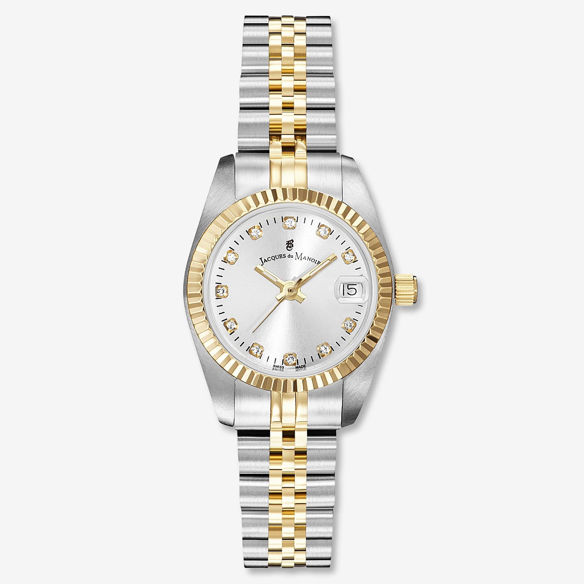Diese Analoguhr von Jacques du Manoir aus der Kollektion "Inspiration" ist aufgrund der edlen Bicolor-Optik in Silber und Gold ein wahrer Eyecatcher. Sie bietet eine Wasserdichtigkeit von 5 Bar und einen sicheren Faltverschluss. Das Zifferblatt ist mit formschönen Zeigern und einer Datumsanzeige auf der 3-Uhr-Position ausgestattet und darüber hinaus mit elf Zirkonia-Steinchen als Indizes besetzt. Eingerahmt wird das Zifferblatt von einer strukturierten Lünette.