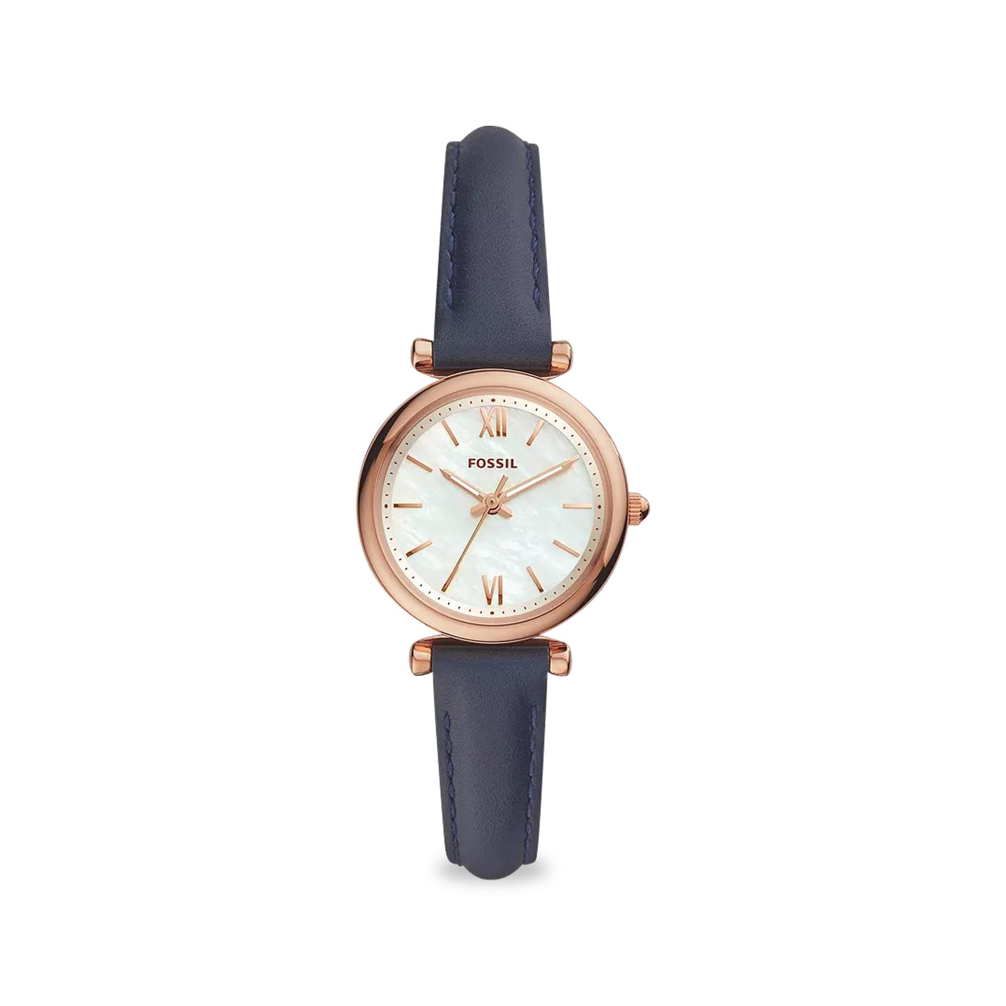 Diese Analoguhr von FOSSIL aus der "Carlie"-Kollektion schmiegt sich mit dem weichen Lederband zart und elegant an das Handgelenk. Als Blickfang fungiert das schimmernde Perlmuttzifferblatt, das mit Stabindizes sowie römischen Ziffern auf der 12- und 6-Uhr-Position versehen ist. Dank Mineralglas ist die Uhr wasserdicht bis 5 Bar.
