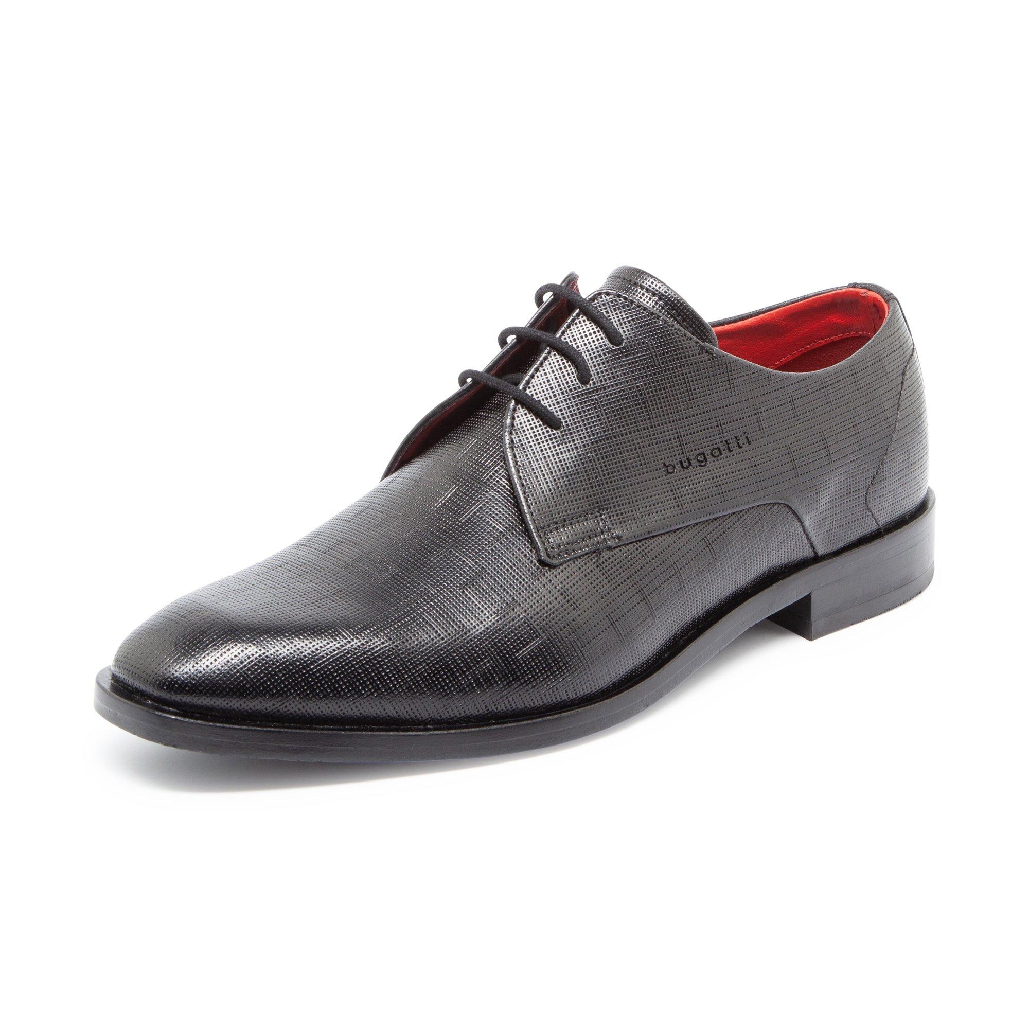 Diese schlichten Herrenschuhe von bugatti bestehen aus hochwertigem Leder. Es ist fein geprägt, wodurch es ein aussergewöhnliches Aussehen erhält. Das rote Innenmaterial unterstreicht die Eleganz zusätzlich. Kurz gesagt: der perfekte Schuh für den Businessalltag oder gediegene Anlässe.