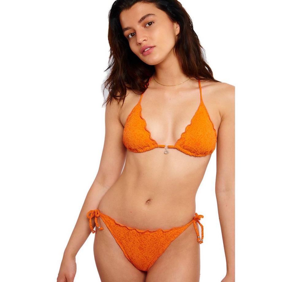 Triangelbikini: Das Oberteil sowie die Bikinihose bestehen bei diesem Modell mehr oder weniger aus zwei Dreiecken. Die dreieckigen Cups werden im Nacken und im Rücken gebunden. Diese Form verspricht dadurch besonders wenig Bräunungsstreifen.