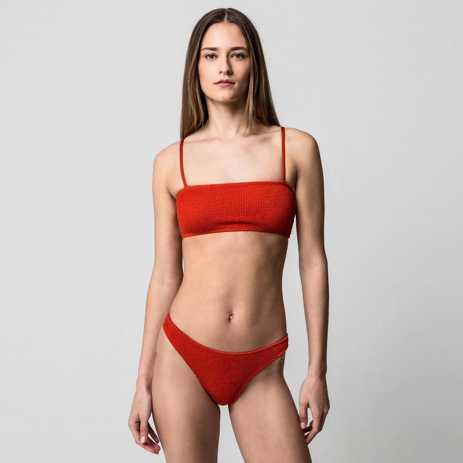 Triangelbikini: Das Oberteil sowie die Bikinihose bestehen bei diesem Modell mehr oder weniger aus zwei Dreiecken. Die dreieckigen Cups werden im Nacken und im Rücken gebunden. Diese Form verspricht dadurch besonders wenig Bräunungsstreifen.
