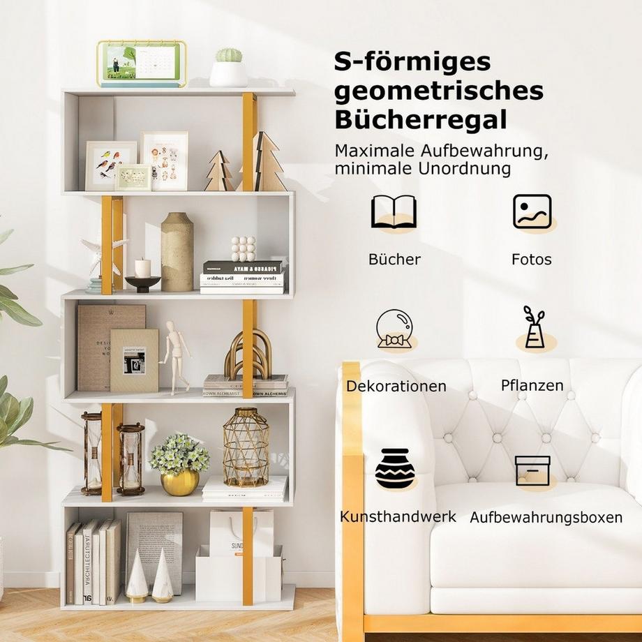 NorthioBücherregal Weiß Standregal mit 5 Ebenen S-förmig Büroregal freistehend 70 x 24 x 157 cm