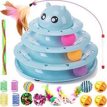 Alopini17 Stück Katzenspielzeug Interaktives Katzenspielzeug für Innenkatzen 3 Schichttürme Rollenspuren Katzenreizspielzeug mit Feder