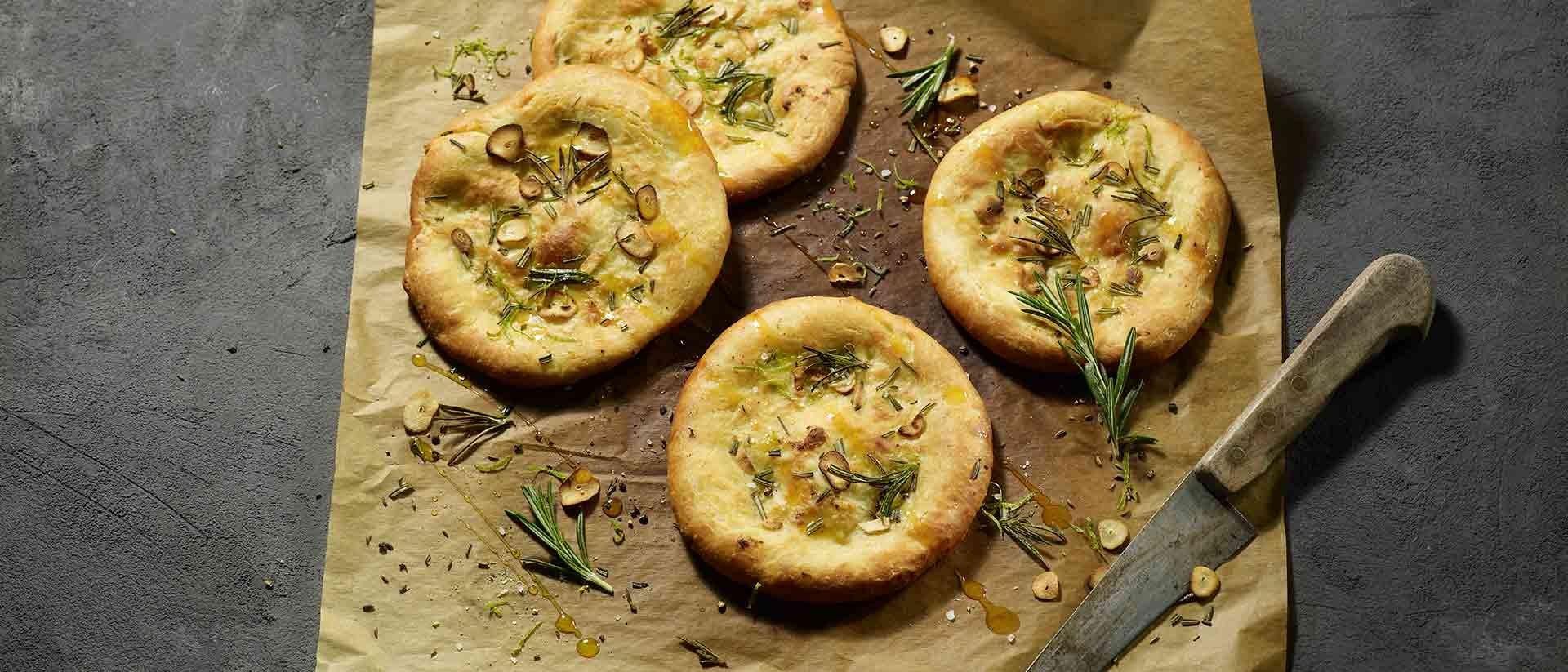 3. Den Teig zu 6 dünnen Fladen formen und mit der geklärten Butter einstreichen. Den Rosmarin und den Knoblauch darüberstreuen. Im Ofen auf Backpapier bei 250 °C für 6-8 Minuten goldbraun backen.