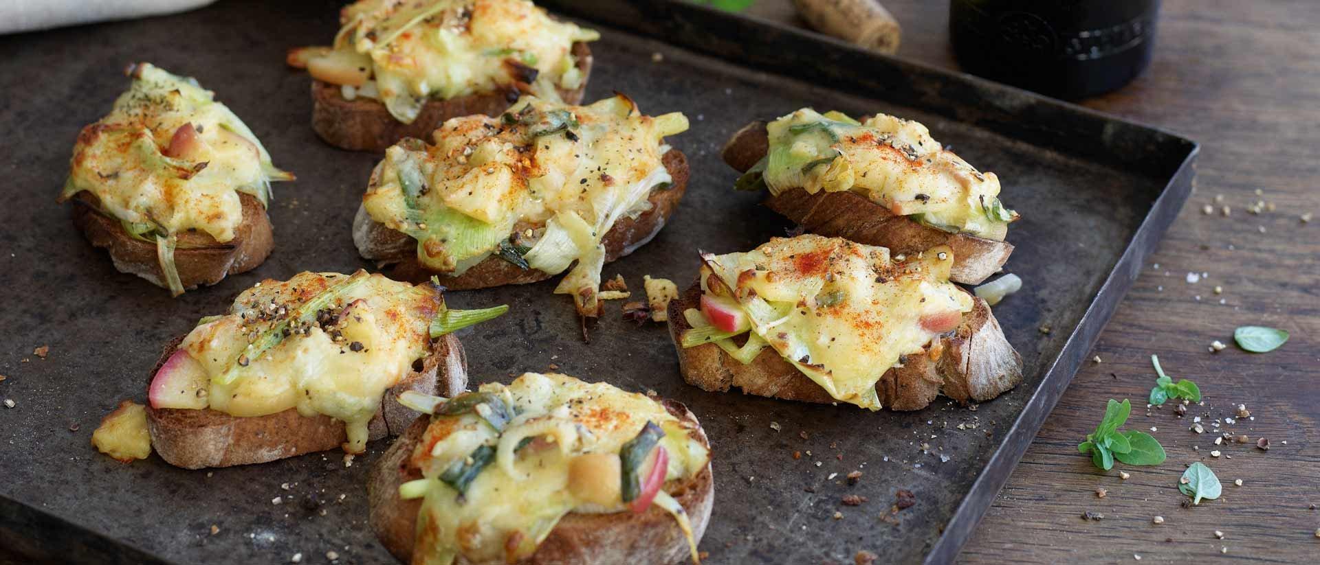 Die Brotscheiben auf ein mit Backpapier ausgelegtes Blech legen. Im auf 220 °C vorgeheizten Ofen backen. Aus dem Ofen nehmen. Die Käsemischung darauf verteilen und nochmals 10 bis 15 Minuten backen. Mit dem grünen Teil der Frühlingszwiebeln bestreuen.