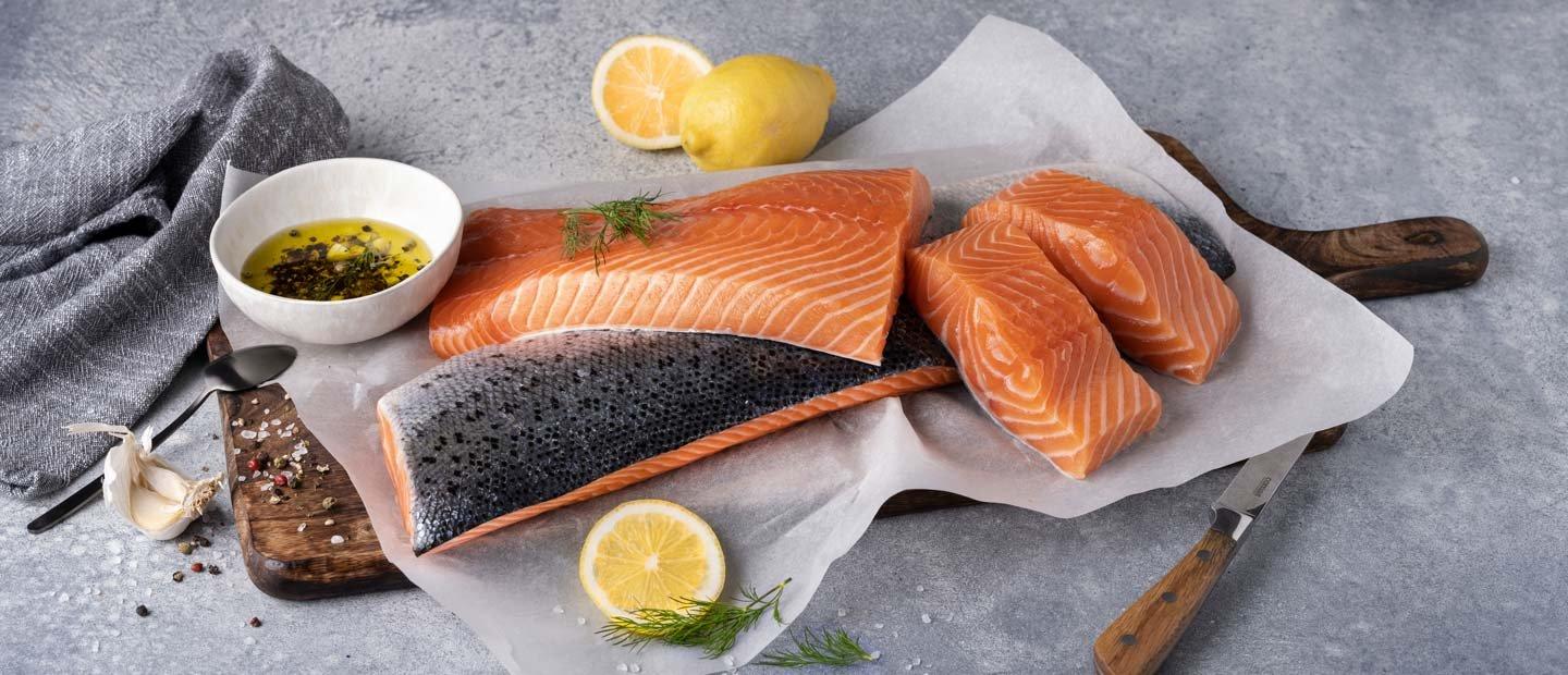 Erhitzen Sie nun etwas Olivenöl in einer Bratpfanne und braten Sie die Lachstranchen mit der Hautseite nach unten etwa 2 Min. an. Wenden und die zweite Seite ebenfalls 2 Min. anbraten.