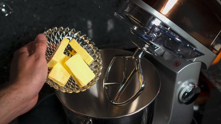 Mit Butter und Zucker starten und gemeinsam in die Schüssel geben. Auf Funktionsstufe 2 schaumig-fluffig schlagen. Danach Ei und Vanillezucker während dem Rühren hinzugeben.