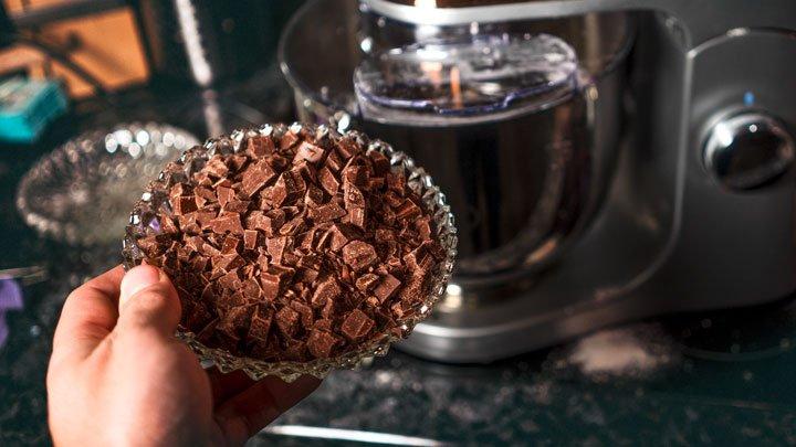 Wenn sich die gesamte Masse vermischt hat, Schokoladenstückchen auf Stufe 3 mitverrühren.