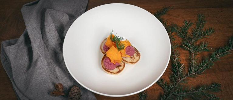 Vorspeise: Dinkelblinis, Rote Beete Merretich, Karottenlachs