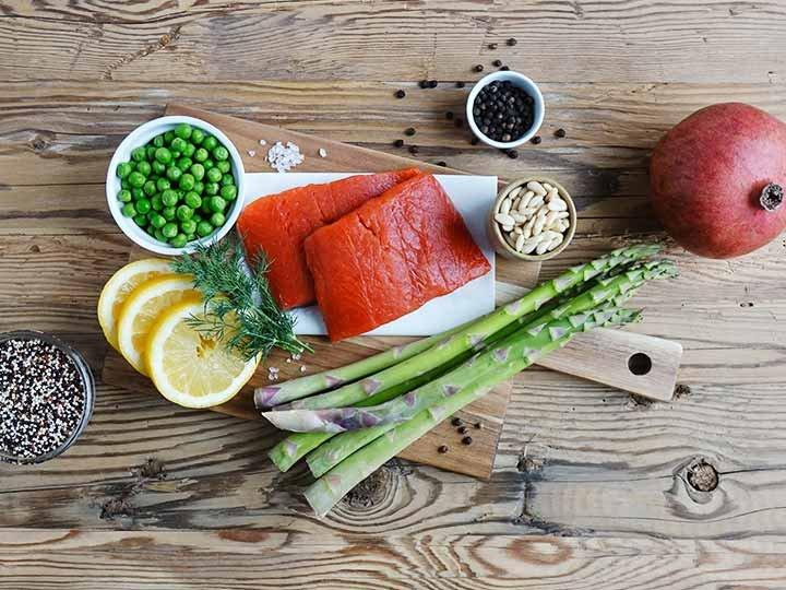 Zutaten: 4 Lachsfilets mit Haut à ca. 200 g, 1 Packung Quinoa à 400 g, 500 g grüne Spargeln, 250 g frische Erbsen, 100 g Pinienkerne, 1 Granatapfel, 1 Zitrone, 1 Bund Dill