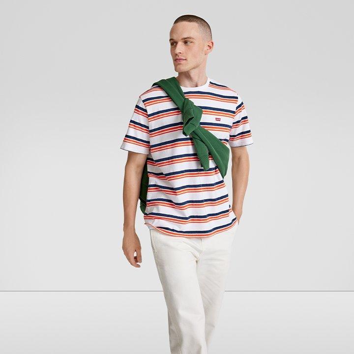 Das T-Shirt mit unterschiedlich dicken Streifen gibt Ihnen was Verspieltes und passt wunderbar zu gemütlichen Freizeitbeschäftigungen. Setzen Sie farbige Akzente und wickeln Sie dazu einen kontraststarken Pulli um die Schulter.