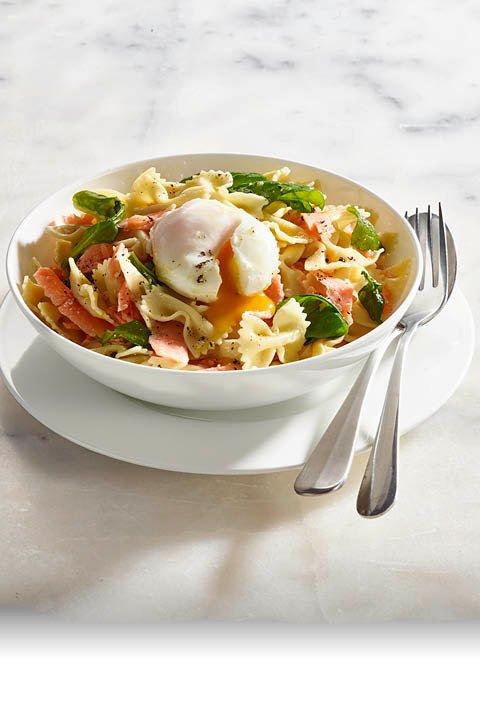 Für 4 Personen 400g Pasta al dente kochen. Schmelzen Sie 2 EL Butter. Vermischen Sie die abgekühlte, aber noch flüssige Butter mit dem Saft von 1 Zitrone, 300g in Stücke geschnittenem Rauchlachs, 1 EL Schnittlauchringli und ein wenig Salz, Pfeffer und Muskatnuss. Nun vermischen Sie die Pasta mit der Buttermischung und 100g Spinatblättern. Mit einem pochierten Ei pro Portion servieren.