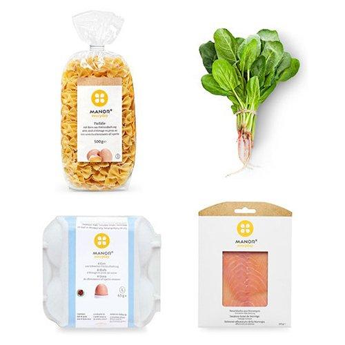 Buttrige Pasta mit Rauchlachs und pochiertem Ei können Sie auch mitten in der Woche geniessen, dank den günstigen Manor Everyday Produkten.