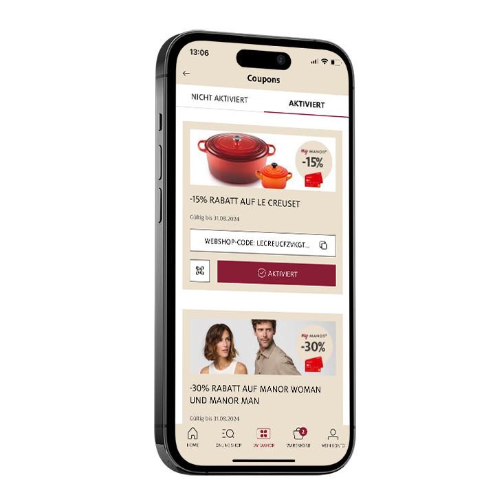 Jeden Monat attraktive Coupons in der Manor App erhalten und im Warenhaus oder Onlineshop einlösen. Exklusiv mit der Manor Karte.