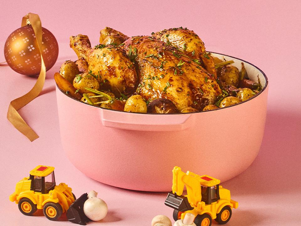 1 Truthahn (ca. 3,5 kg) – 1,7 kg kleine Kartoffeln – 6 Rüebli – 3 gelbe Zwiebeln – 1 Knoblauchknolle – 250 g Champignons – Butter – neutrales Öl – Thymian – Lorbeer – Rosmarin – Salz – Pfeffer – glatte Petersilie