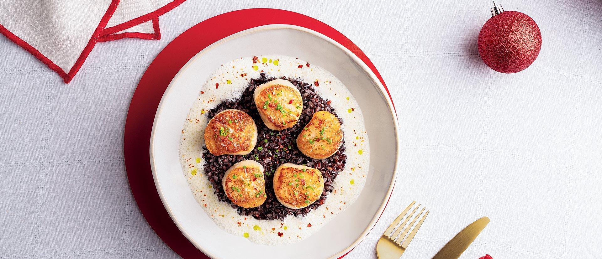 Gebratene Jakobsmuscheln, Venere-Reis, Fisch-Espuma.