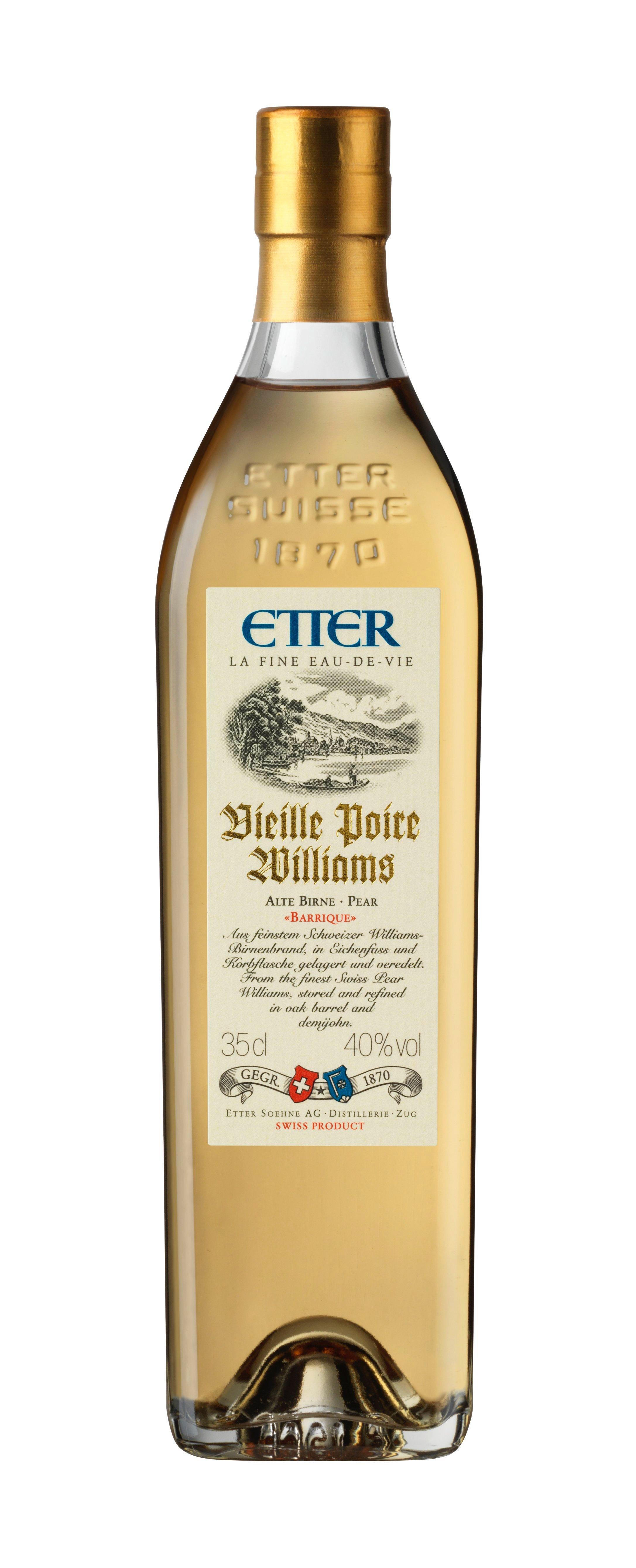 Une bouteille de 70 cl de Vieille Poire Williams Etter contient l’équivalent de 11 kilos des meilleures poires Williams valaisannes, sous forme liquide. Dans notre produit, le bois et le fruit s’unissent de la plus belle manière. Laissez-vous séduire – vous serez conquis !