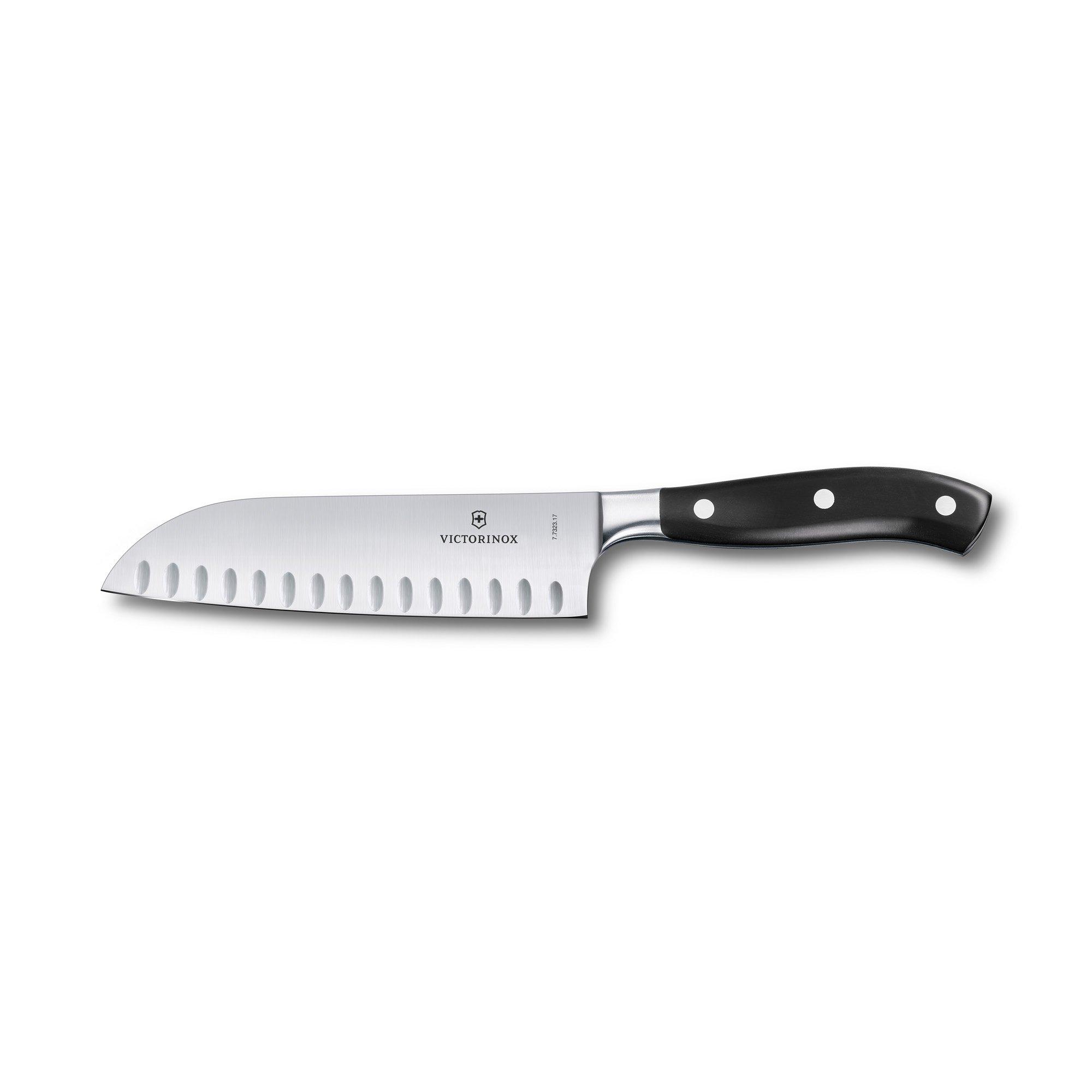 Le couteau Santoku de haute qualité de Victorinox a une lame forgée avec un affûtage cannelé et un manche en polypropylène noir.