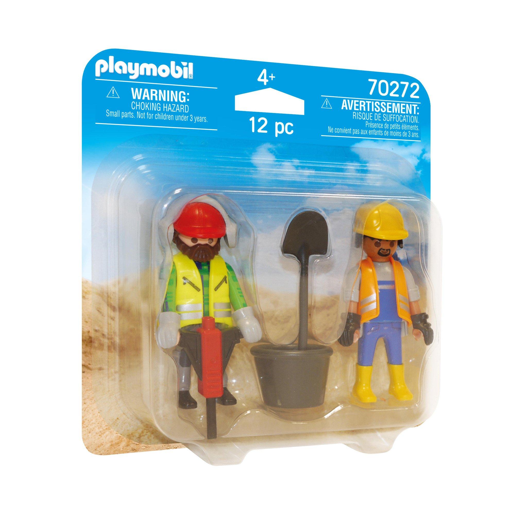 L'ensemble comprend deux ouvriers du bâtiment avec un marteau-piqueur, une pelle et un seau.
