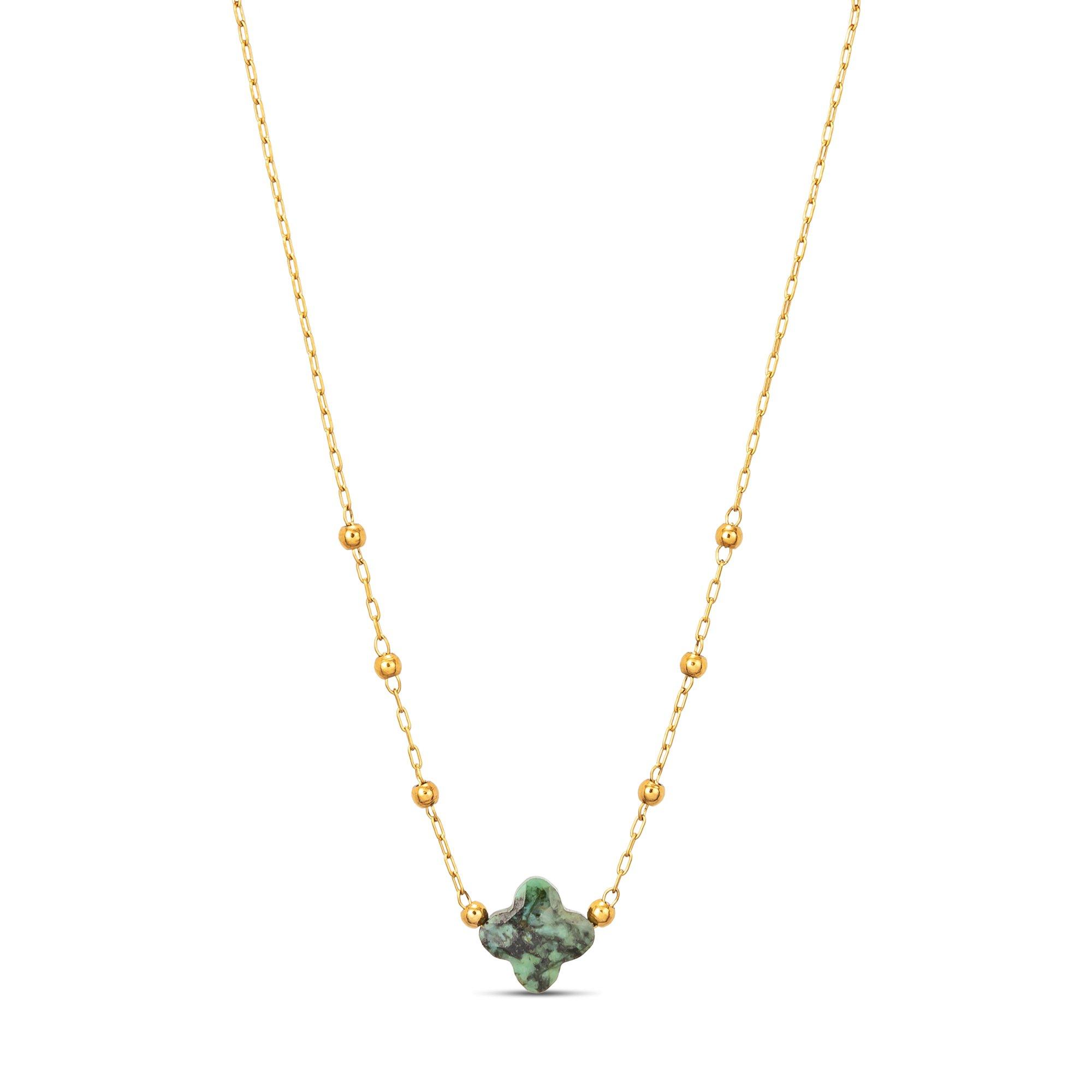 Le collier à la mode de ZAG Bijou est en acier inoxydable hypoallergénique. L'élément vedette du collier est une pierre naturelle en forme de fleur à quatre pétales.