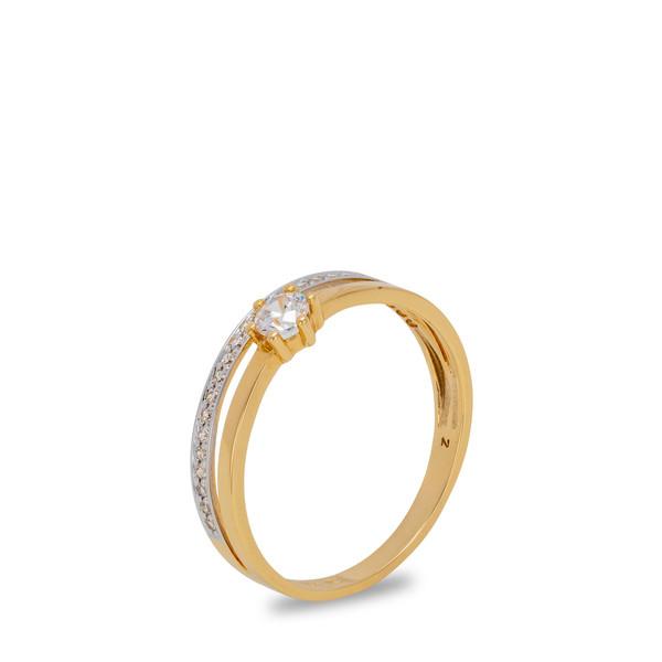 Une bague élégante de la marque L'Atelier Gold 18 Karat by Manor en or jaune 18 carats de haute qualité. Elle est divisée au centre en deux brins et est raffiné avec des pierres de zirconium scintillantes. Un bijou merveilleusement intemporel.