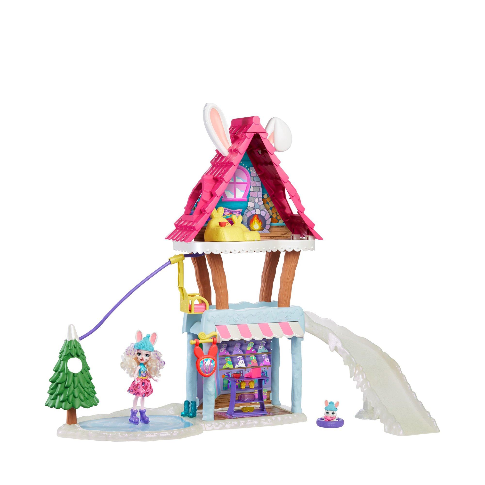 Ce magnifique chalet inclut une poupée de 15 cm de hauteur et un animal. Il dispose de 4 espaces de jeu comprenant une chambre, un magasin, un toboggan, une patinoire et même un télésiège. Il inclut 11 accessoires pour enrichir le jeu avec les deux personnages.