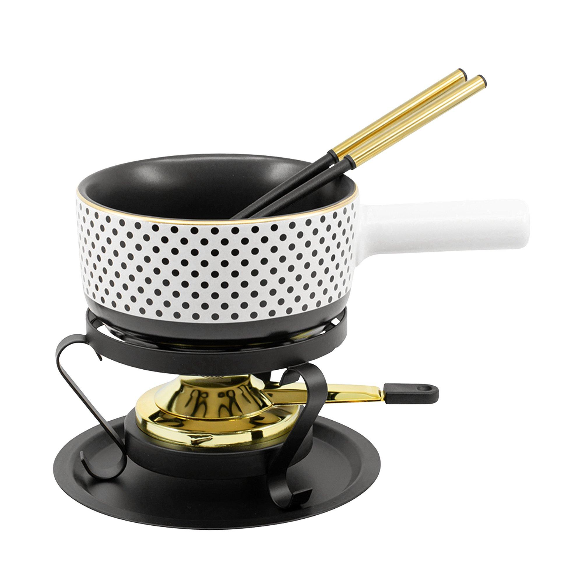 Le set à fondue de haute qualité Element dans le style 'à points' de Kadastar impressionne par une combinaison parfaite de look moderne et de formes traditionnelles. Le caquelon est un développement interne de Kadastar et vous étonnera par sa base en céramique épaisse. Grâce à la répartition optimale de la chaleur, vous ne connaissez le problème du fromage brûlé que lorsque vous en entendez parler. Le brûleur à 8 trous de haute qualité a non seulement l'air chaud, mais déclenche également le caquelon correctement.