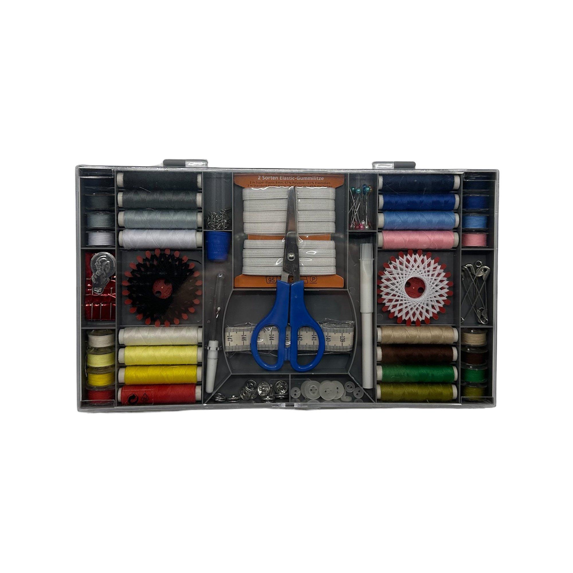 Le kit de couture parfait pour chaque ménage. 11 pièces pour les besoins en couture dans une boîte à clic pratique avec des séparations.