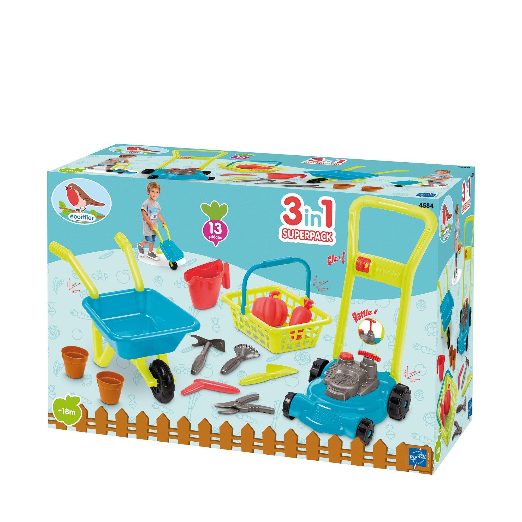 Ce pack contient les must have du jardiner. Une tondeuse avec démarreur et variateur de vitesse, un panier garni de 10 accessoires et outil de jardin, et une brouette.