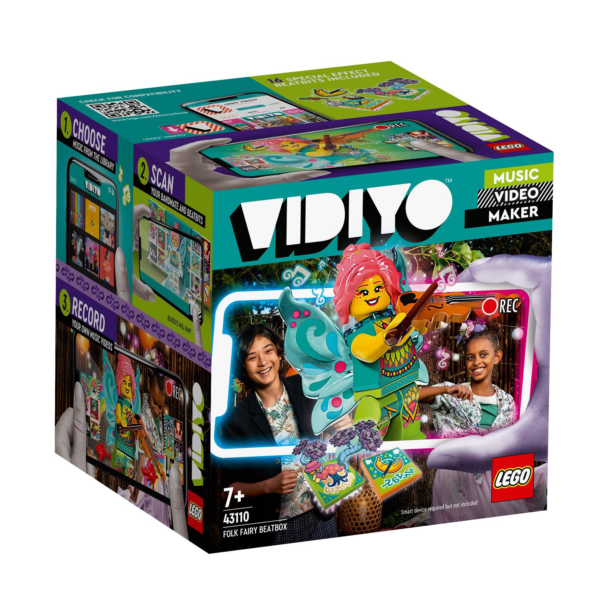 Faites découvrir la réalisation de clips vidéo aux enfants fans de musique et de spectacle avec le set LEGO® VIDIYO™ Folk Fairy BeatBox (43110). Téléchargez l’appli gratuite et scannez la figurine musicale pour révéler la personnalité folk de la fée sur scène. Puis scannez les BeatBits pour débloquer des effets spéciaux. Les enfants vont adorer relever des défis et produire leurs clips de musique folk uniques à partager sur le flux social sécurisé.Jeu à emporterAiles de fée, fleur, violon ou motif personnel, les enfants vont adorer décorer leur BeatBox avec les pièces LEGO. La BeatBox se replie pour pouvoir ranger les BeatBits et la figurine et les emporter partout.Créateur d’expériences musicalesLes sets LEGO VIDIYO offrent une expérience de jeu social sûre et proposent aux enfants de devenir réalisateurs, producteurs et stars de leurs clips. La production de vidéos alliant mélanges musicaux, personnages amusants, chansons, danses et effets spéciaux stimule la créativité.