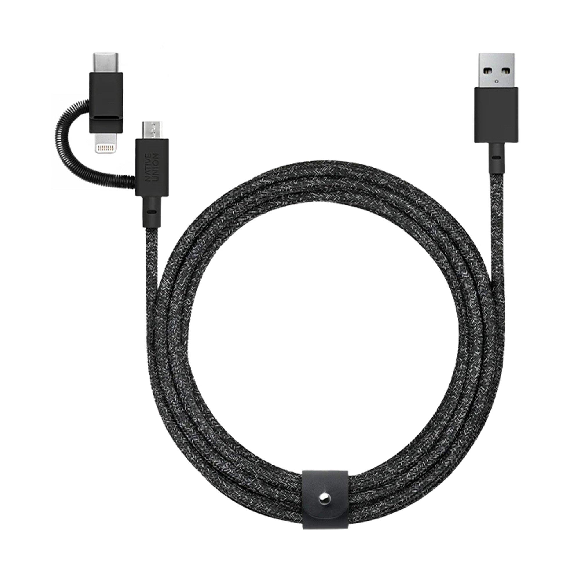 Câbles pratiques Micro-USB, Lightning et USB-C 3-en-1 de 2 mètres de long en tresse de nylon robuste - smartphone Cosmos, tablette, Kindle, écouteurs, batterie externe ... tous équipent en permanence nos vies d'appareils supplémentaires. Presque tout le monde a un câble ou une connexion différent, ce qui rend difficile de penser à tout le monde chaque fois que vous voyagez. C'est désormais chose faite. Une triple prise intelligente qui tient compte à la fois du design et de la fonction. Désormais, vous n'avez besoin que d'un seul câble. Un câble qui s'adapte à tout. Le Belt Cable Universal a un connecteur 3-en-1 Micro-USB, Lightning et USB-C afin que vous puissiez l'utiliser avec tous vos appareils techniques. Avec la même construction renforcée et un bracelet en cuir véritable que toute la série Belt Cable, vous pouvez profiter d'une charge rapide avec style qui dure longtemps. Avec la connexion 3-en-1 Micro-USB, Lightning et USB-C, vous n'aurez besoin que d'un seul câble pour tous vos appareils à l'avenir, où que vous soyez. Le ressort métallique pratique est élégamment attaché à l'extrémité et garantit que vous ne perdez jamais vos connexions, quelle que soit celle que vous n'utilisez pas actuellement. Enroulez votre câble facilement et commodément avec la ceinture en cuir attachée pour un transport pratique. Cela signifie qu'il n'y a pas d'encombrement de câbles inutile et que le câble est toujours à portée de main. Comme toute la série Belt, celui-ci est en nylon robuste tressé et de fibre DuPont™ Kevlar®, ce qui le rend plus solide et plus durable que jamais. Tous les câbles Native Union sont certifiés Apple MFi et USB-IF - car vous devriez pouvoir compter sur la qualité de quelque chose que vous utilisez tous les jours. Longueur du câble : 2 mètres Connexions du câble : USB-A, Micro-USB, Apple Lightning et USB-C Matériau du produit : nylon, TPE, cuir, acier Poids : 0,07 kg