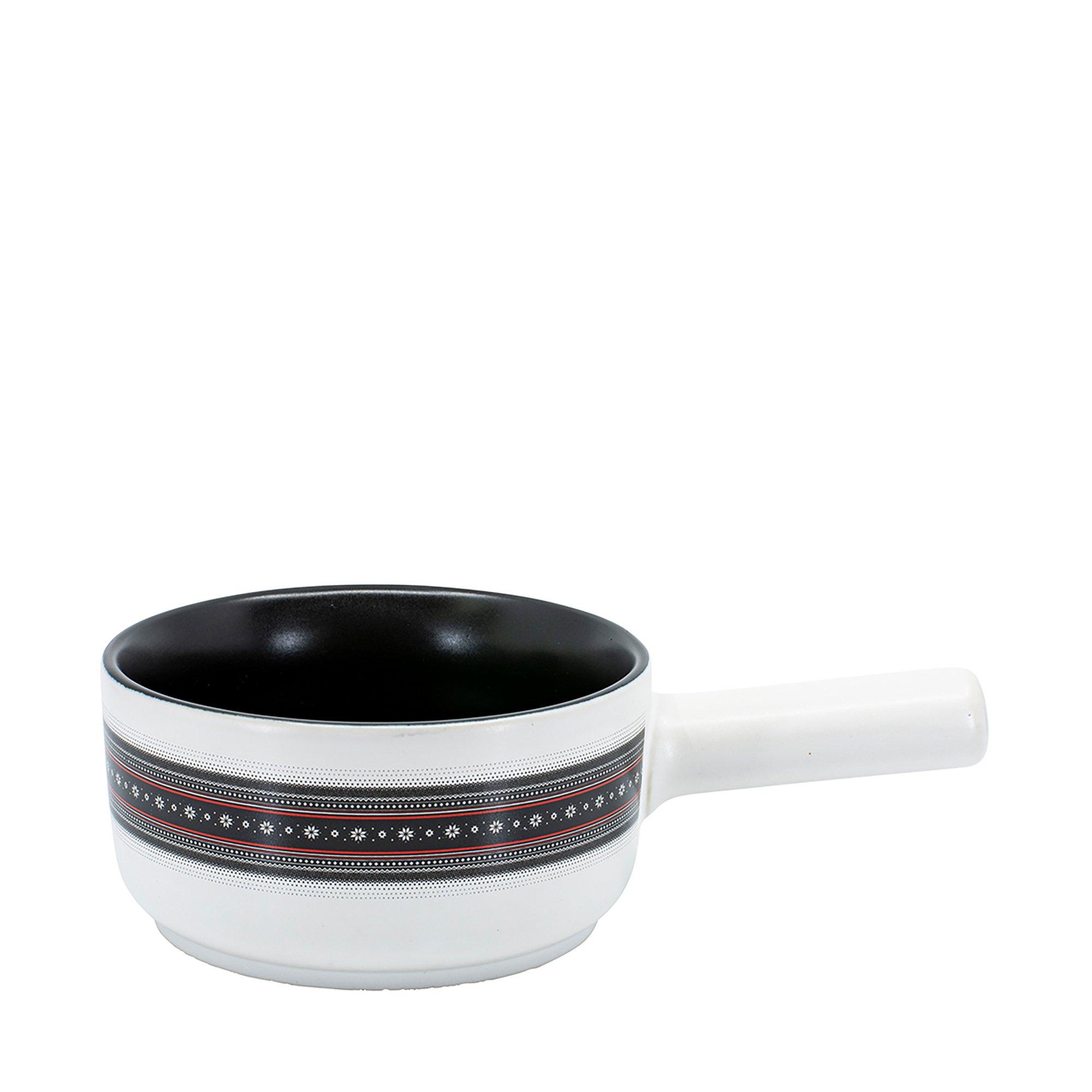 Fonduecaquelon en céramique réfractaire avec base extra épaisse pour une parfaite répartition de la chaleur. Intérieur noir, extérieur blanc avec décoration.